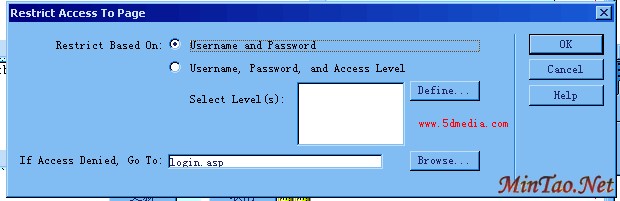 Restrict Ased On:页面保护的类型,这里我们选择username and password(用户名和密码)。 If Access Denied, Go To:如果非法访问,则转到哪个页面,这里我们选择让非法访问的转到login.asp(登陆页)。