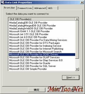 由于我们将要链接的数据库是Access2000的数据库,所以我们选择Microsoft Jet 4.0 OLE DB Provider,单击Next。