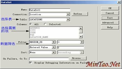 Connection 是选择数据源,Table是选择表,Column是选择项目,Filter是用于筛选数据,由于此页面是显示Europe的数据,故设Entered Value=3。On Failure,Go To是用于处理读取数据出错时跳到的页面。