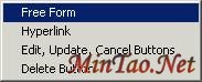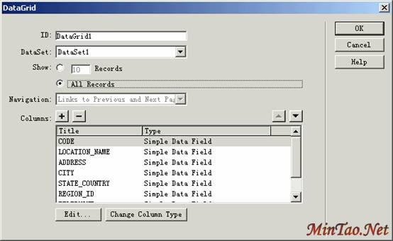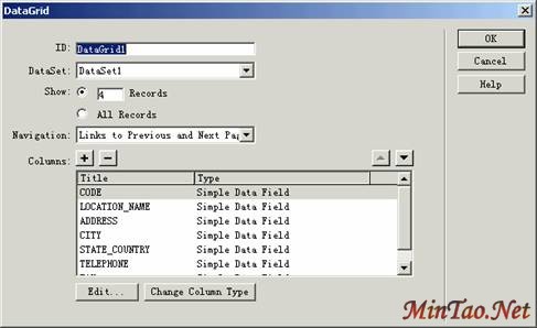 进入属性修改页面,我们可以通过”+”,”-”来增减所要的列,同时可以单击Edit设置每一项对应的数据项,以及Title的名字。单击Change Column可以设置每一项的类型其中包括Free Form(自由设置每列包含的数据,而且可以添加自己的内容),Hyperlink(设置为超链接),Edit,Updata,Cancel Buttons(可以用于快速建立管理页面),Delete Button(删除记录)