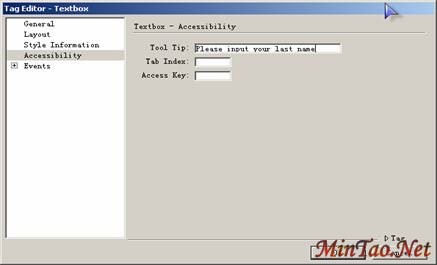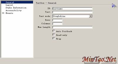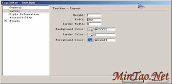 在DreamweaverMX中可以通过单击 快捷按钮来添加textbox控件。在弹出的对话框中通过设置ID,text mode(对话框类型),tool tip(即鼠标悬于控件上的提示),以及Layout(样式设计),Style Information(用于设置输入文字格式以及textbox边框格式),来设置控件。下图是textbox的设置对话框。