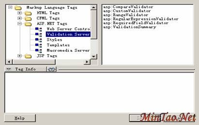 在单击More Tags后,选择ASP.NET Tags的Validation Server可以看到有不同类型的数据验证控件选择。我们需要在First_name的输入框后面添加验证控件asp:RequiredFieldValidator。