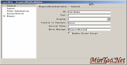 在RequiredfieldValidator控件设置窗口中,Control to Validate是为与此数据验证控件相关联的输入控件的ID,而Error Message就是数据验证失败的时候显示的信息。同时我们可以通过设置layout,style Information来选择所需的样式。