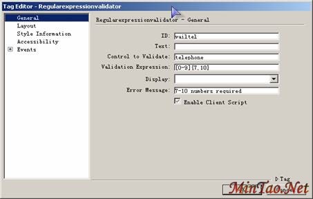 同RequiredfieldValidator验证控件添加的方法类似,单击”More tags..”选择添加数据验证控件。不同的地方就是设置Validation Expression。由于telephone需要输入7-10位的数字,需设置如下: