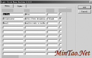 Styles是负责设置菜单外形的,有两种选择:img src="http://tech.china.com/zh_cn/netschool/homepage/167718/20020521/images/11257823_63732.jpg"> “Windows Type Menu(Default)” 是默认项——最朴实的样子,熟悉的Windows风格; “Custom Menu” 自定意菜单,如果你选择了这一项,还要对下面的内容进行设置: “Menu Width”,菜单的宽度; “Font”,字体; “Font Color”,字体颜色; “Font Side”,字体大小; “Background Color”、“Background Image”,背景色及背景图; 还有“Cursor”,是用来选择鼠标样式的。 以上的这些设定好了,就可以点“Add”生成效果了。预览一下,不错吧?