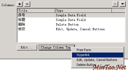 在以往UltraDev的使用过程中要链接到显示详细数据页一般都是通过“Go To Detail Page”服务器行为,而NET环境下服务器行为视窗中却没有提供该行为,那么链接该如何做呢?答案还是在DataGrid控件的设置中。