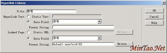 在页面中插入一个表格,将“DataSet2”记录集中的字段依次绑定到合适的位置,还有不要忘了使用Server Behaviors → Show Region → Show If DateSet Is Not Empty行为设置当“DataSet2”记录集为空的时候隐藏表格,如下图。 完成后我们要再次编辑DataGrid控件,在对话框中设置序号为传递“xid”参数的链接,在“Columns”域中选择“序号”,然后点击下方的“Change Column Type”转换列类型按钮选择“Hyperlink”超链接项 在弹出的“Hyperlink Culumn”对话框中如下设置 Title:“序号”——显示列的标题 Hyperlink Text:——超链接文字,这里包括有三个项目 Static Text:——你可以在此写入文字作为链接 Data Field:“序号”——你可以选择记录集中的字段来作为链接 Format String:——你可以定义字段的显示格式 Linked Page:——链接到的页面,这里也有三个项目 Static URL:——链接到静态的页面 Date Field:“序号”——这里是指选择“序号”字段作为传递到下页的参数值 Format String:“default.aspx?xid={0}”——使用右边的按钮选择要链接到的页,我们的细节记录也在本页就选择“default.aspx”就可生成前面的字符串,需要注意的是自动生成的参数名称是中文的“序号”文字,我们在建立“DataSet2”记录集时指定参数名为“xid”,所以这里要手工修改。 完成后如下图 点击“OK”返回存盘测试一下吧。 其它的一些补充 1.在DataGrid控件中我们已经用过了四种显示类型,也基本知道了它们的使用方法,还剩下一种是“Free Form”。这是一种比较自由的显示类型,你可以在这里加入合并几个动态记录或者在其中加入文本,也可以是表达控件,总之这是提供的一个灵活显示手段。 2.大家应该还记得我们在编辑“Hyperlink Culumn”超链接对话框时有个“Format String”项目设置为空的,如果又需要又该如何设置呢?翻阅了ASP.NET文档我们作如下尝试,在此框内加入字符串“{0:X}”,如下图 存盘后在浏览器中我们可以看见下图 “序号”字段是以十六进制格式显示数值的,原因是在格式字符“X”上,下面是几个格式字符说明 C 以货币格式显示数值。 D 以十进制格式显示数值。 E 以科学记数法(指数)格式显示数值。 F 以固定格式显示数值。 G 以常规格式显示数值。 N 以数字格式显示数值。 X 以十六进制格式显示数值。 3.如果需要“序号”字段的链接是以新建窗口形式打开的,那该如何呢?这次DataGrid控件中似乎没有提供此功能,我们试着改改源码吧。转到源码视窗,找到对应“序号”字段的代码:DataNavigateUrlField="序号"DataNavigateUrlFormatString="default.aspx?xid={0}" DataTextField="序号"Visible="True" HeaderText="序号"/> 在代码最后加上“Target="_new"”字符串,使之成为DataNavigateUrlField="序号"DataNavigateUrlFormatString="default.aspx?xid={0}" DataTextField="序号"Visible="True" HeaderText="序号"Target="_new" /> 好了,这样就可以了,当你再次点击序号上的链接记录就是以新窗口形式出现了。 Dreamweaver MX中ASP.NET环境下的DataGrid控件基础用处就这些吧,当然你可以利用修改代码获得更多功能,还是老话,Dreamweaver MX在你开发ASP.NET时可以提供效率,而目前所具有功能的还十分不足,所以多看看源码、了解源码还是使用好Dreamweaver MX的关键。