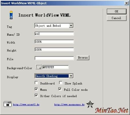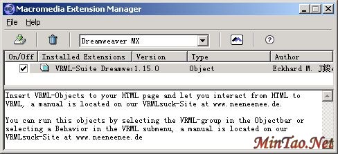 前言:众所周知,我们生成的VRML作品有时需要插入指定的网页中。在没有指定的浏览的情况下,我们可以用EMBED在HTML中通过手工编辑源代码来直接链接引用VRML文件。不过我们知道,目前由于没有一个垄断的专业浏览器,并且各家技术开发公司的层次不一,常常会导致同一个作品,在不同的浏览器中浏览效果的不同。这个现状决定了有时我们必须指定一个浏览器来达到创作效果的最佳显示,有了外国友人专门开发的vrmlsuite115的Macromedia Dreamweaver的Mxp格式插件后,我们就可以很方便高效地在网页的特定位置插入VRML作品了。