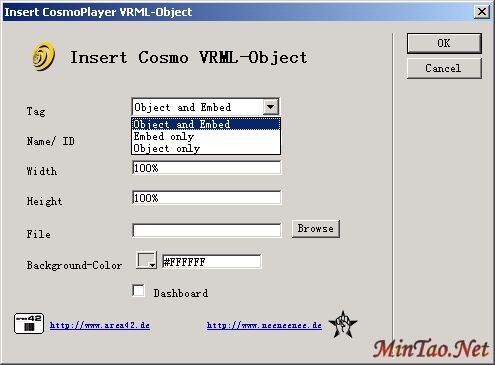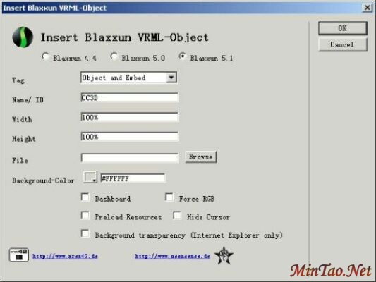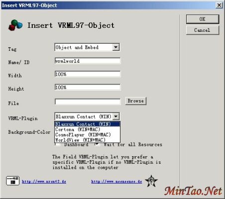 点击安装vrmlsuite115的mxp文件后,在Macromedia Extension Manager中我们可以看到如下的文件信息。 这样的话,当我们进入Macromedia Dreamweaver后,在浮动的快捷面板上的VRML上看到如下所示的面板。 图中的VRML快捷面板中列出了几个常见的大名鼎鼎的VRML浏览器图标,我们可以通过点击来选择所要指定运行的VRML浏览器。 让我们先来看看Blaxxun公司的VRML浏览器所支持的VRML作品使用情况。首先,看一下我们要设置的第一个选项,如下图,从已经列出了Blaxxun 浏览器的版本:从Blaxxun 4.4、Blaxxun5.0到Blaxxun5.1中要指定一个版本,一般情况下,当然是越高越好,对不^_^。 在Tag标签中有三种选项:object(物体) and Embed(嵌入)、Embed only和Object only.默认设置为Object and Embed. Name/ID: CC3D (此项不要改,CC3D是Blaxxun公司VRML浏览器插件的ID身份标识) Width(宽度)、Height(高度)两个选项的设置就不用讲了。 File(文件)选项中,可以直接填写链接的URL资源,也可以点击Browse浏览按钮,在弹出的对话框中进行选择确定,关键要注意一个浏览时的路径问题就行了。 Background-color(背景色)的设置:这里面有颜色选择器,使用起来十分方便,也不讲了。 下面的选项设置分别是:Dashboard (仪表扳)、Force RGB (强制为RGB颜色)、Preload resource(加载资源)、Hide Cursor(隐藏光标)、Background Transparency(背景透明,Internet Explorer only只适用于IE浏览器)。 Cortona公司的VRML浏览器所支持的VRML作品使用情况,和Blaxxun的比较一下,多了几项设置,如下图所示: Mask(蒙板层)、 Skin (皮肤)、Navigation(导航模式)、 Navigation Speed(导航速度)、 Show Splash(显示噼呖溅泼声)、 Menu(菜单)、 3D-border (3D边界显示)、wait for all Resources(等所有资源下载后显示)选项。 接下来分别是Cosmo浏览器、Piveron浏览器、VRML97-object(选择VRML作品浏览时所用浏览器)、WorldView浏览器使用设置,因为设置使用差不多,所以就……