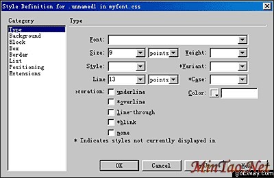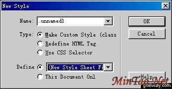 如上图,在 Name 处为你的样式起一个名字,Dreamweaver 默认会在名字前一个小数点,目的是避免与其他HTML标记混淆,例如我在这里起的名字是“myfont”(将unamed1改为myfont);Define 是选择使用外部样式表还是只在本页建立样式(This Document Only),我们选择前者,这样就可以多页共用一个样式表,确定按 OK。