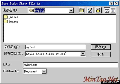 再接着的对话框中,输入样式表文件的名称,例如是“myfont”,按“保存”,这样就生成了一个叫myfont.css的样式表文件,如上图。
