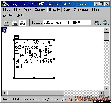 如果你觉得用表格对页面元素进行定位太难掌握,不妨尝试利用层(Layer)这个好东西。点击属性面板的 按钮,光标会成为一个十字,在编辑窗口上拖动,就可以创建出一个层,我们可以在层上输入绝大部分的网页元素,例如图片、文字等。层的好处是可以放置在页面的任何位置,如下图: