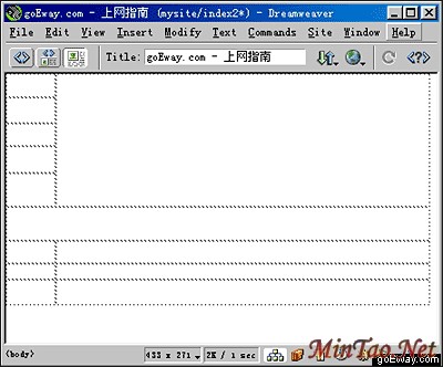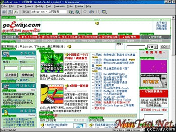 Make Column AutoStretch:列自动伸缩,就是表格可以按照屏幕比例来自动调整宽度,相当于将表格的宽度定义为百分比。 Add Spacer image/Remove Spacer Images:增加/移去透明图片。透明图片的作用就是撑住表格的宽度。 Clear cell Heights:清除单元格高度。 以下,就是goEway.com利用在利用Layout功能进行页面排版的情景,与标准视图相比,就直观得多了。