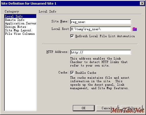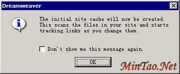 定义好了这两项后其他的都可以不用管了,如果你比较感兴趣的则需要另外找一本比较详细地介绍Ultradev的书? ^0^ ,点击OK后Ultradev会告诉你一个站点的缓冲会被建立,开始跟踪你创建的文件间的联系,这样当你修改某一文件是可能影响到其他文件的连接时Ultradev就能够帮你自动的修改好。
