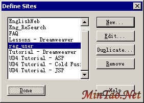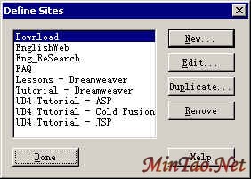 1.运行Ultradev,选择菜单 Site -> Define Sites 出现的就是这个界面啦,默认的话是只有Ultradev预先定义的三个站点的,点击New创建自己的站点。