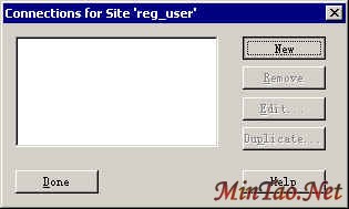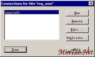 点击New -〉 Data Source Name(DSN)建立一个新的连接,接下来就会打开数据源名称连接的对话面板。从Data Source Name(DSN)栏下拉就可以看到我们在前面创建的名为userinfo的数据源名称了。其实也可以不用从控制面板打开数据源(ODBC)的对话框而从这里的Define按钮打开数据源(ODBC),然后创建过程是一样的。选择好DSN后,再在Connection Name栏里填写一个名字,方便记忆即可。这里取名为userinfo,点击OK后我们的数据库连接就做好了。