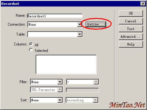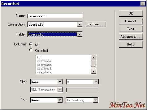 这下Connection栏里就有内容了,下拉选择刚才创建的数据库连接(userinfo),然后Table一栏就会显示出你数据库里面有哪些表,如图,显示了我们创建好的userinfo表。Columns表示你的数据表字段,默认是ALL,便是选择所有的字段。Filter 和 Sort 一栏我们现在还用不上,后面再讲到。这些都做完之后我们就算是创建好了一个记录集了,接着再为这个记录集起一个易记的名字,既Name一栏。点击OK。