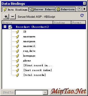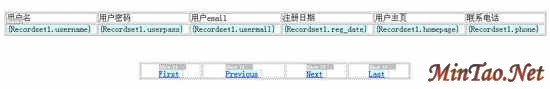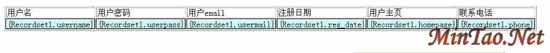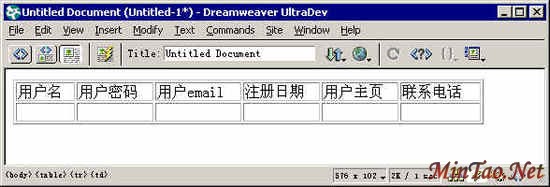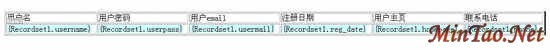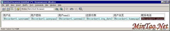 第三章:应用数据库创建动态网页第三节:显示数据库记录终于到了显示Dreamweaver Ultradev威力的时候了,先让我们来看看怎么用Ultradev来实现数据的显示功能。很简单的,跟着我来吧。 上一回我们创建好了数据集后,在Data Bindings面板中就有如下的显示: 然后我们创建一个由2行*六列的表格,列数由数据表的字段数决定,至于为什么要两行,看下去你就会明白了。填上必要的信息后页面如图所示: 接下来的工作很简单,选中在Data Bindings面板中出现的字段名称,把他拖放到我们刚才创建的表格中,效果如图所示,这样就表示我们要在对应的单元格中显示数据库中某个字段的值。但这样子还是不够的,还需要一步才能将数据库里面的记录全部显示出来。 选中我们刚才拖放字段进去的那一行,效果如图所示: