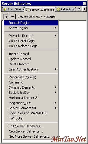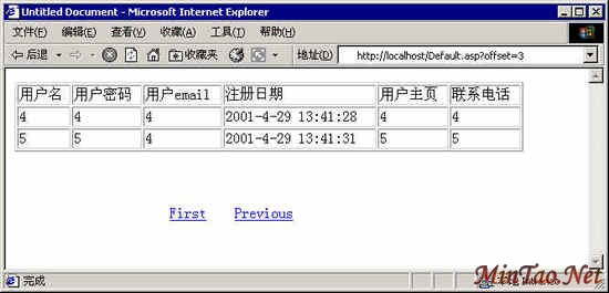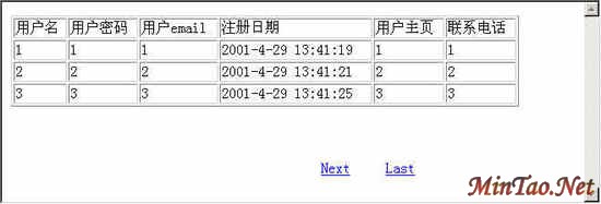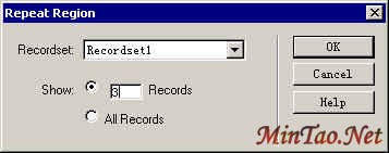 切换面板到Server Behaviors ,我们的主角要上场了。我们要为这些数据施加一些动作,让他们乖乖的听我们的话,按我们想要的样子显示出来。选择Repeat Region : 接下来的对话框是要你在一页中显示多少条记录。当你的数据库里面有几千条记录时,我们不可能将他们全部显示出来,这样会使网页加载速度变慢,一般都是采用分页的形式来显示数据,用到的就是这个Repeat Region行为了。这里我们选择每页显示3条记录。 点击OK后如图所示: 让我们切换到浏览器窗口,察看我们刚才生成的程序,哦,别忘了把这一页保存为你在Internet信息服务管理器中设定的默认文档名,这里是default.asp。在浏览器窗口的地址栏里输入 http://localhost 看到的效果如下。呵呵,是不是很激动,数据库里面的数据显示在我们的眼前,你也发现,原来创建一个Web应用也不是很难。嗯,高兴了一会儿,好像发现有哪里不对劲是吧,对了,这里只显示了3条记录,而我们刚才在我们的数据库中手工输进去了5条记录,其他的呢?好,让我们接下去完善一下我们的程序。