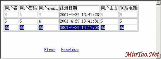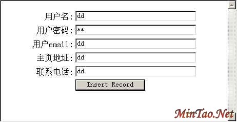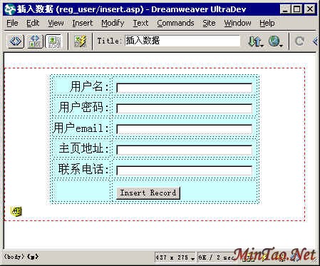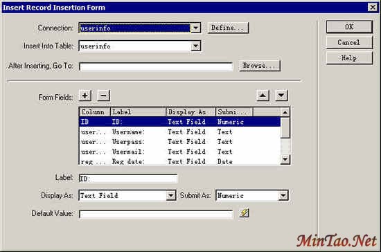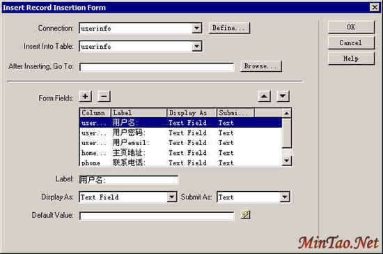 connection是我们已经在站点中已经定义好的数据库连接,选中后,在Insert Into Table一栏中就会出现你所连接的数据库中的表,从中再选择你要插入数据的表。我们的数据库只有一个userinfo表,选中他。接着在下面的Form Fields中就会出现我们在表设计中设计好的字段及其相关属性,Column表示数据库表中的字段名,Display As表示用何种类型的表单域,比如文本表单域(Text Field)来提交我们的纪录,Submit As表示作为何种数据类型来提交,比如数据类型为整数性的字段我们就不能用文本数据类型进行提交。一般这一栏Ultradev会帮我们自动选择的。Label呢则帮助提示你这个表单域填写的内容。After Inserting, Go To一栏是当你提交完数据跳转到那个页面去的意思,比如一般注册成功后都会跳转到一页,告诉你你已经注册成功了,欢迎使用什么什么的,就是这样子的。如果什么都不填的话就表示提交完数据后返回本页面。