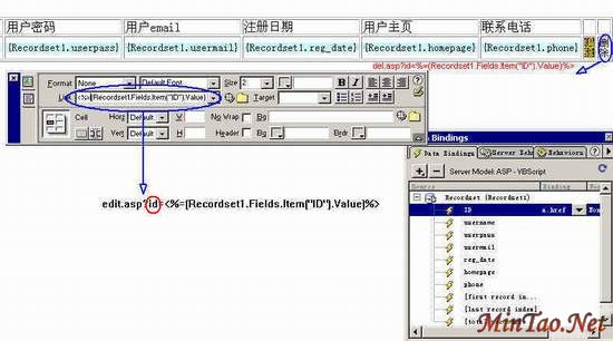 朋友们看到了没有,<%=(Recordset1.Fields.Item("ID").Value)%>其实就是我们Data Bindings中的ID字段的值了。每一个记录对应只有一个唯一的ID值,也就是这个<%=(Recordset1.Fields.Item("ID").Value)%>,当edit.asp获得这个值的时候就能取出这条记录来,至于怎么取,让我们往下看。对了,对删除的连接也是做这样的处理。