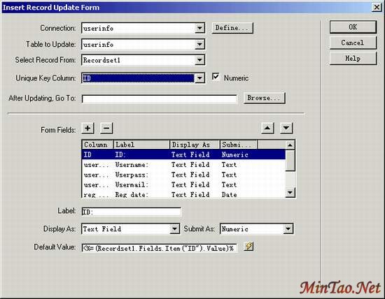 噢!是不是跟那个Record Insert Form很像啊,不同的地方只多了一项Unique Key Column (唯一关键字字段),也就是我们上面唠叨了半天的主键了,选择为ID字段,接下来的事就简单了,按照我们在添加纪录一节中学到的,修改到你满意为止。Defulat Value不用管它,最终结果如图所示。