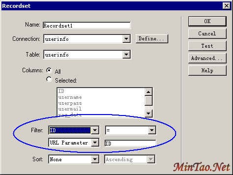 以前我们创建记录集的时候并没有用到Filter。顾名思义,它是根据一定的条件来过滤掉某些我们不需要的数据。Filter里面列出的是你数据库表的字段,这里我们选择,然后将条件设置为" = " ,接着我们下拉ID下面的选择框,选择URL Parameter,填上ID。