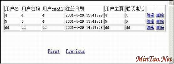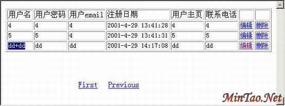 让我们打开我们开始做的那个数据显示的页面来,添加多两个单元格,分别做上编辑和删除的连接,如图。