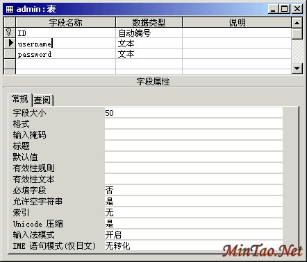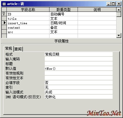 除了表article中title取文本类型,字段大小为200;insert_time去默认值为:=Now();src取文本类型,字段大小为255外,其余如图,均取access的默认值。