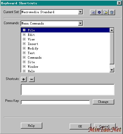 Current Set选项:它提供了四种固化的快捷键方案,这是不允许你改的。选项分别是:BBEdit,Dreamweaver3,HomeSite,Macromedia Standard。其中BBEdit,HomeSite,以及Dreamweaver3都是网页设计软件。