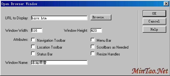 在DW编辑框中按F8调出Behaviors面板,点击 选Open Browser Window立刻出现以下窗口: