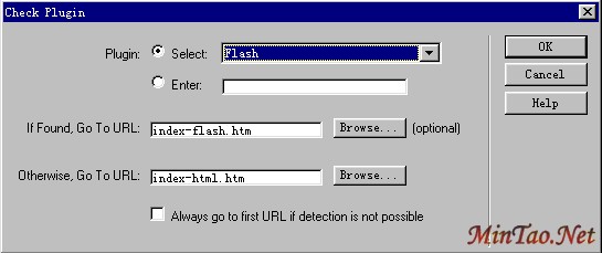 为让网页的浏览速度更快,有时不得不用Flash动画代替Gif动画,但并不是所有的人都安装了其插件,一个好的网站为解决此问题,一般给出两种版本,Flash版和Html版,但需要我们自己选择进入那一个版本,随着上网的普及并不是所有的人都知道什么是Flash,什么是Html,这部分网民怎么选择?我们可以让你的网页自己做出选择进那一种版本,一解后顾之忧。这就是我们本节要讲的主要内容——Check Plugin(检查插件)。