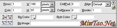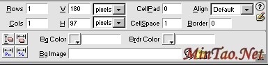 同样在网页中指定位置插入一个单行单列的表格,用鼠标单击表格外框的任何一个部位以选中它,在属性板中将“Border”值设定为1,也可以同时将另外的“CellPad”和“CellSpace”置零,如图: