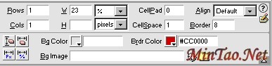 选中已经插入的表格,在属性板中将“Border”值设定为“8”(可为需要宽度的任意值),同时特别注意要把“CellSpace”重置为“0”,最后通过“Brdr color”设定边框的颜色,这里仍以红色为例,如图