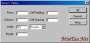 首先在网页中插入一个1行3列的表格对象,在插入过程中直接把“Border”设定为0,“CellSpace”设定为2,“CellPad”设定为1,如图