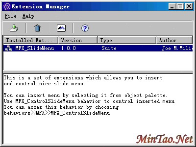 当然,要使用mxp插件必须先安装扩展管理器,安装的方法很简单,直接双击运行,然后按照提示进行选择目录就可以了。扩展器安装完毕后,会在Dw“Commands”菜单中出现一个“Mange Extensions”(管理扩展)命令,点击它后执行,就可以利用工具栏上的安装 和卸载 来对插件进行管理,需要指出的是,这里的卸载并不是真正地删除这个插件,而是暂时禁用,随时可以再通调入使用的。