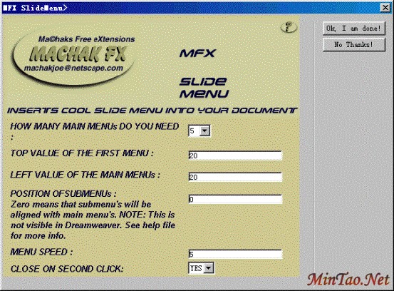 Dw的扩展管理器和SliderMenu插件都可以免费下载的,大家可以到5Dmedia.com上下载,如果对这个插件的使用有任何疑问,给我发邮件:lakesea@netease.com。