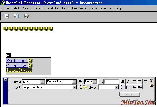 可以在编辑区看到实际上这个插件是在Dw中插入了一系列的层,层的排列顺序是:第一个主菜单,第一个主菜单的子菜单,第二个主菜单,第二个主菜单的子菜单……根据这个顺序,可以分别对这些层进行编辑,输入自己想要在菜单上显示的文字,并在文字属性的Link一栏加上这个菜单的超链接。经过一阵重复的输入工作后,这个动态下拉菜单就作成了,得意地欣赏欣赏你的大做吧。:)