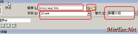 ( 3 )当绘制完矩形热点区域后,图像属性面板将变成热点属性面板,如图 3 所示。在链接栏处选择热点区域所要链接的目标网页,在【替代】框中填入相关的提示说明,并使链接的网页在新窗口中打开。