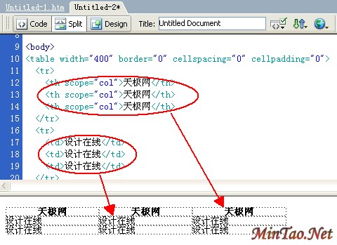 表格设置对话框上半部分的“ Table Size ”部分的功能在以前的版本中我们已经见过了,中间“ Header ”增加了表格基本格式的选项,我们可以根据自己所设定的表格要求在四个模板选定一个样式,简化了我们自定义表格的工作。 例如我们选择“TOP”格式,设计一个三行三列的表格,初看好像表格的界面并没有多大的变化,但是我们再看看“Code”面板下的源代码,发现第一行的标记和下面两行的标记不同。如果我们再在表格中输入文字,发现第一行的文字默认居中,并且是粗体显示,而下面两行的文字还是默认靠左排列,没有粗体效果。如图2