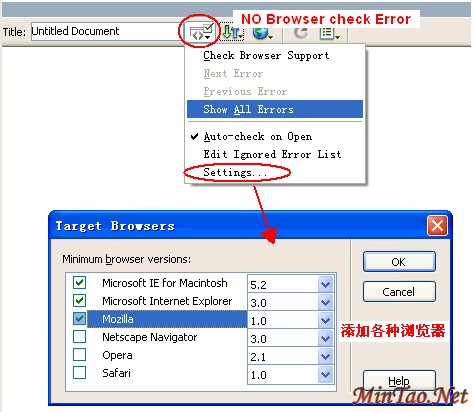编辑网页时,可以选择“Auto-check on open”一直运行自动错误检测命令,实现动态检测。在“Settings”中打开浏览器设置对话框,选择可以检测的浏览器工具和版本。