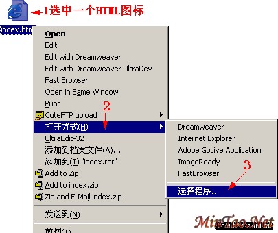 还有一种更简单的办法,那就是选定一个Html文件,按住shift键,点鼠标右键,在弹出的右键菜单中选择“打开方式”,在弹出的对话框中找到dreamweaver程序文件,选择它作为始终用于打开hmtl的关联程序。