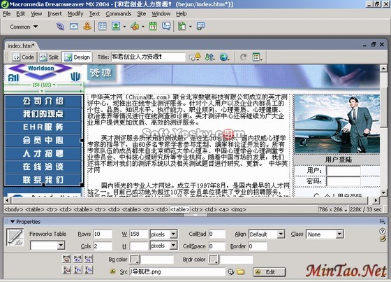 第一步:单击表格内部,再单击状态栏中的table标签选择整个表格。属性面板就会将所选区域自动识别为Fireworks表格,并在属性面板中显示该表格的已知PNG源文件的名称。然后,在属性面板中单击按钮。在如图19所示的实例中,我们将进行详细的操作演示,对这一过程加以实际模拟。