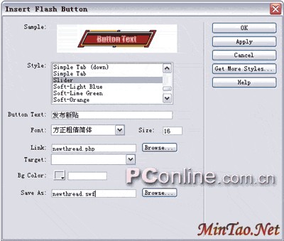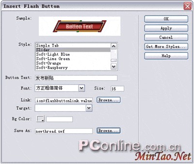 这里先介绍一下普通的flash按钮的制作方法,以Dreamweaver MX为例:新建一个HTML文件,并先保存它。然后在“Insert(插入)”菜单的“Media(多媒体)”标签中,点击“Flash Button(Flash 按钮)”按钮,弹出如图所示的对话框。在对话框的“Style(样式)”项,选择“Slider”,“Button Text(按钮文字)”填入“发布新帖”,“Font(字体)”选择“方正粗倩简体”(需要另外安装),“Link(链接)”填入“newthread.php”,“Save As(保存为)”填入“newthread.swf”,最后点击“OK”按钮即可。