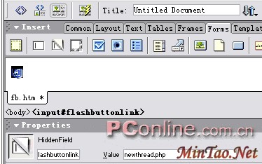 制作flash按钮前,先在“Insert(插入)”菜单的“Forms(表单)”标签中,点击“Hidden Field(隐藏域)”按钮,若出现提示“Add Form Tag?(添加表单标记吗?)”,如果没有其他需要,可选择“No(否)”。然后如下图,在“Properties(属性)”窗口中,修改该隐藏域的名称为“flashbuttonlink”,Value值为“newthread.php”,此Value值即为以后flash的链接值。然后按照以上所介绍的插入flash按钮的方法创建一个flash按钮,所不同的是,“Link(链接)”值请填入“javascript:window.location=flashbuttonlink.value”,且“Target(目标)”值请留空或选“_self”,如图。OK,动态的flash按钮已经做好了!如果要改变链接的值,则改变隐藏域“flashbuttonlink”的Value值即可。在论坛等动态页面中自动创建不同的链接,也就可以向用户端输出不同的“flashbuttonlink”的Value值而实现,这就不用我多说了吧?