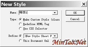 1、在Dreamweaver编辑窗口中,点击菜单命令“Window/Css Styles”打开样式浮动面板,在浮动面板中点击右键菜单中的“New Style”选项或者点击右下角带“+”的按钮,打开新增样式对话框(如图1),在“Name”栏中输入新增特效名称,并选择Type的第一个选项:“Make custom style”,然后点击“OK”按钮,并在出现的保存对话框中输入文件名保存样式文件。