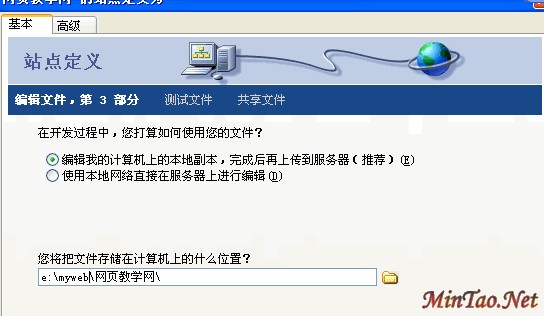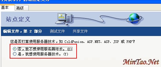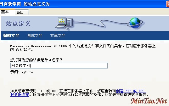 闲话少说,现在我们就开始利用Dreamweaver mx 2004 定义我们的站点了。 下面我们打开【主菜单】——【站点】里面的站点管理 新建一个站点 好了现在出现了下一个界面、我们先讲解“基本定义站点模式”选择基本之后你会看到“你打算为您的站点起什么名字?”在里面输入你网站的名字。在点底下的按钮“下一个”。 下面我们看到,设置服务器技术选项,有2个选项, 第一个是“否,我不想使用服务器技术” 第二个是“是,我想使用服务器技术”。这个选项决定你是否使用数据库脚本语言。关于数据库方面的知识我们在后面一一解答,下面的例子先学习静态站点的定义。 ⊙“静态”网站的致命弱点就是不易维护,为了不断更新网页内容,你必须不断地重复制作HTML文档,随着网站内容和信息量的日益扩增,你就会感到工作量大得出乎想象。 ⊙那么什么是动态网站呢?所谓“动态”,并不是指那几个放在网页上的GIF动态图片,在这里笔者为动态页面的概念制定了以下几条规则 1、“交互性”即网页会根据用户的要求和选择而动态改变和响应,将浏览器作为客户端界面,这将是今后WEB发展的大事所趋。 2、“自动更新”即无须手动地更新HTML文档,便会自动生成新的页面,可以大大节省工作量。 3、“因时因人而变”,即当不同的时间、不同的人访问同一网址时会产生不同的页面,是不是很酷? 我们下面的例是定义静态网站所以,我们选择“否,我不想使用服务器技术”之后点“下一个” 之后看见 2个选项,第一个是编辑我的计算机上的本地副本,完成后再上传到服务器,我们选择这个选项,之后点右面的“小文件夹”