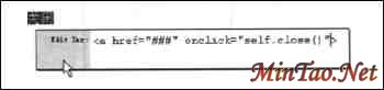 7.在状态栏左端的快速标记编辑器上,单击标记按钮。选中“关闭”链接,然后按下Ctrl+T组合键,打开快速标记编辑器,进入到快速标记编辑器的编辑标记模式。然后在“>”前输入“onclick="selfclose()"”。如图3所示,设置完毕,单击OK按钮,确认操作。这样在Index.html被作为子窗口打开后,单击该链接就可以立刻关闭该子窗口。