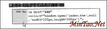 11.可以通过为该链接应用Open Browser Window行为来设置单击链接时打开Index.html窗口,不过更方便的方法是利用快速标识编辑器。方法是首先将插入点放置到链接中,然后在状态栏左端的标识选择器上,单击标识按钮,选中整个链接。然后按下Ctrl+T组合键,打开快速标记编辑器,进入到快速标记编辑器的编辑标识模式。再在“>”前输入“onclick="window.open('index.html',null','width=200px,height=200px')"”(如图4所示)。设置完毕,按下回车键,确认操作。
