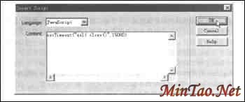 5.单击设计视图窗口中的文档头部窗格。选择菜单Insert/Invisible Tags/Script,打开Inset Script对话框。如图2所示,在Language下拉列表框中选择JavaScript选项,并在Coctento文本框中输入“setTimeout("self.close()",15000)”。单击OK按钮,完成在文档头部插入15秒后自动关闭子窗口的脚本。在代码中,15000表示15000毫秒,也即15秒,也可以根据需要将之修改为自己需要的时间毫秒数。